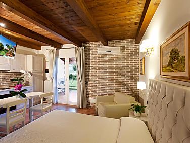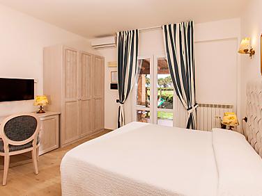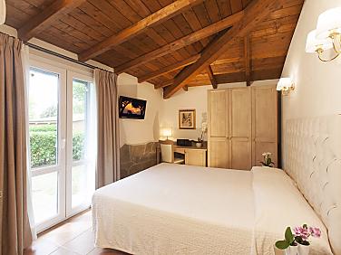 Partially covered walls in natural stone, solid wood furniture, canopy bed, independent air-conditioning and heating system, LCD TV, mini fridge, safe, bathroom with whirlpool, hair dryer, independent porch with table and chairs, enclosed garden with hammock and barbecue.