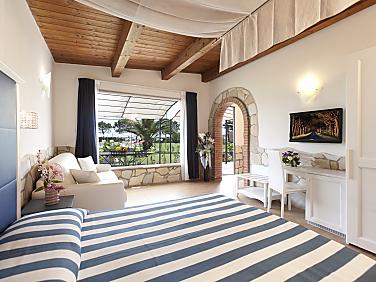 Independent semi-detached villa with independent air-conditioning and heating system, LCD TV with personal decoder (free channels only), double bed, fireplace, stereo, safe, walls partially covered in natural stone, bathroom with walk-in shower, hair dryer, dining area with double sofa bed and a fully equipped kitchenette with fridge, freezer and espresso coffee machine. Veranda with table, terrace with barbecue, hammock and private garden. Outdoor hydromassage mini-pool and outdoor shower.