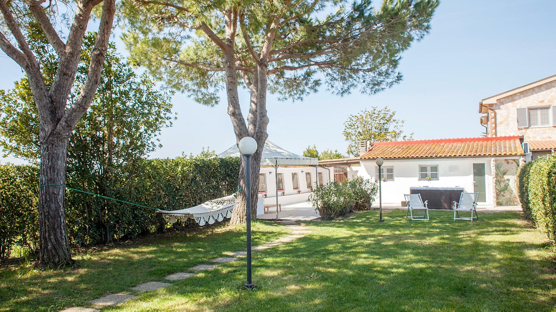 All’esterno portico con tavolo in ceramica decorato a mano (Deruta) e sedie in ferro battuto, terrazzo con barbecue, ampio giardino recintato da rete alta 1,80 m con amaca, Mini Piscina con idromassaggio ad uso esclusivo e doccia esterna.
