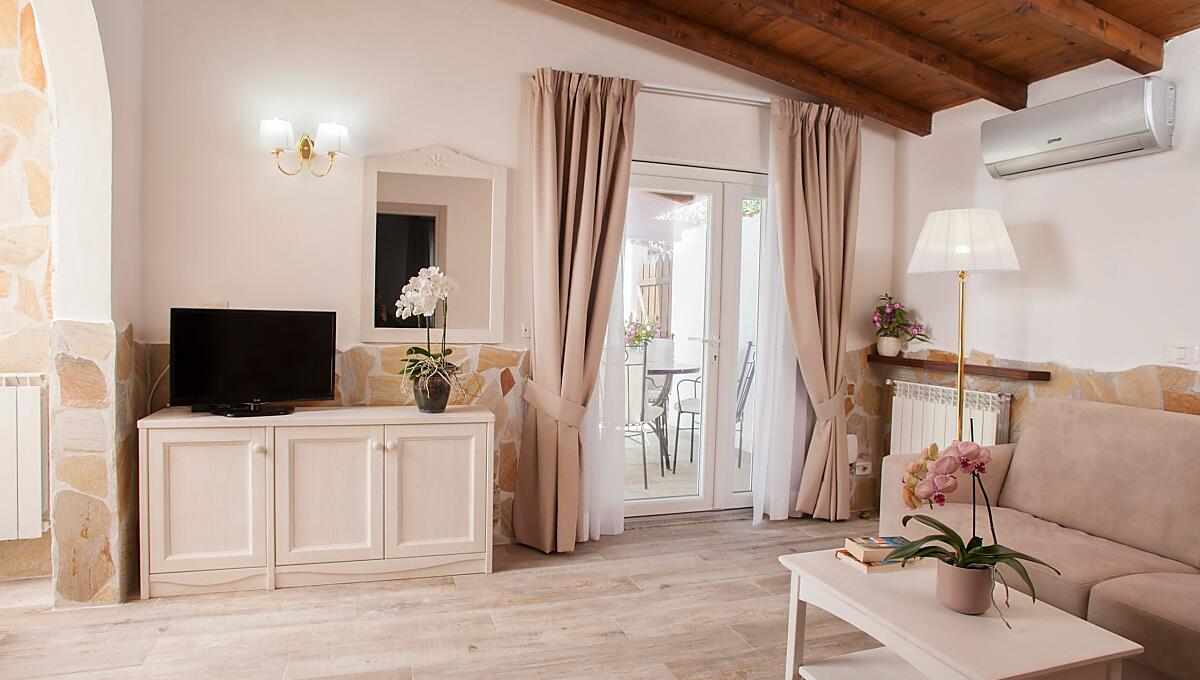 Dotata di camera matrimoniale, soggiorno con divano letto matrimoniale e letto singolo in ambiente separato, bagno con doccia walk-in, asciugacapelli, Free Wi-Fi, climatizzazione con controllo individuale della temperatura, TV 32” sat, angolo cottura di cm. 160 in ambiente separato, frigo/congelatore.